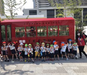 実現したのは8月。イケバスを貸し切って年少・年中・年長を2グループに分けて乗ることができました。ルートはこちらで選べます。また、予約する時にルートの提案をしていただいたりと、当日までウキウキしていました。豊島区運動場を出発して、都電荒川線(東京さくらトラム)と平行して走り巣鴨のとげぬき地蔵経由で終点はイケサンパークエリア。
