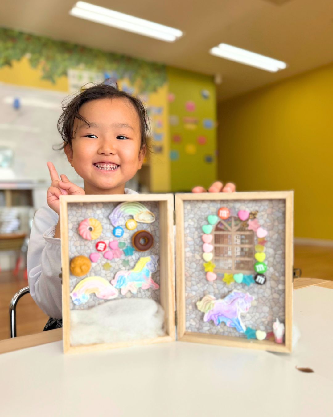 今月、K2クラスのショーアンドテルのテーマは「わたしの魔法のドア」です。子どもたちは、自分の想像の世界につながる魔法のドアをデザインします。一人ひとりがオリジナルのドアを作り、そこにどんな場所に行けるのかを発表しながら、楽しみながら英語の語彙や文章の構造を学んでいます。