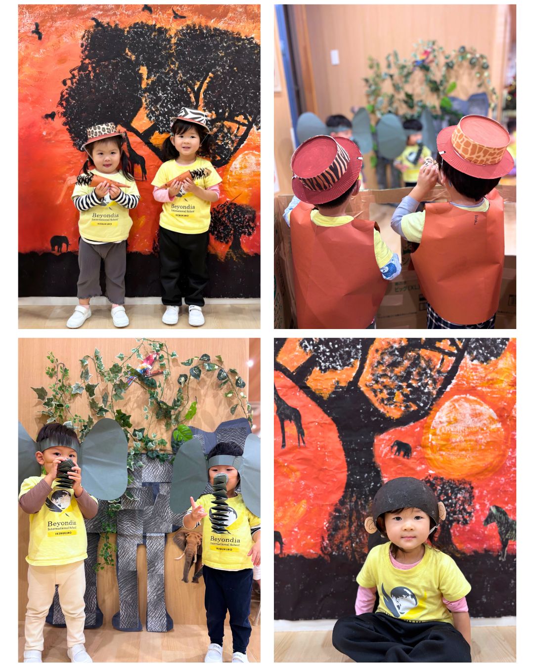 午後には、パンプキンによるサファリごっこを行いました。キリン、ゴリラ、ライオン、ゾウなど、子どもたちは好きな動物になりきって動きを表現しました。他の子どもたちは想像のサファリトラックに乗り込み、動物を探しながら楽しみ、教室がまるでアフリカのサバンナのように広がりました。