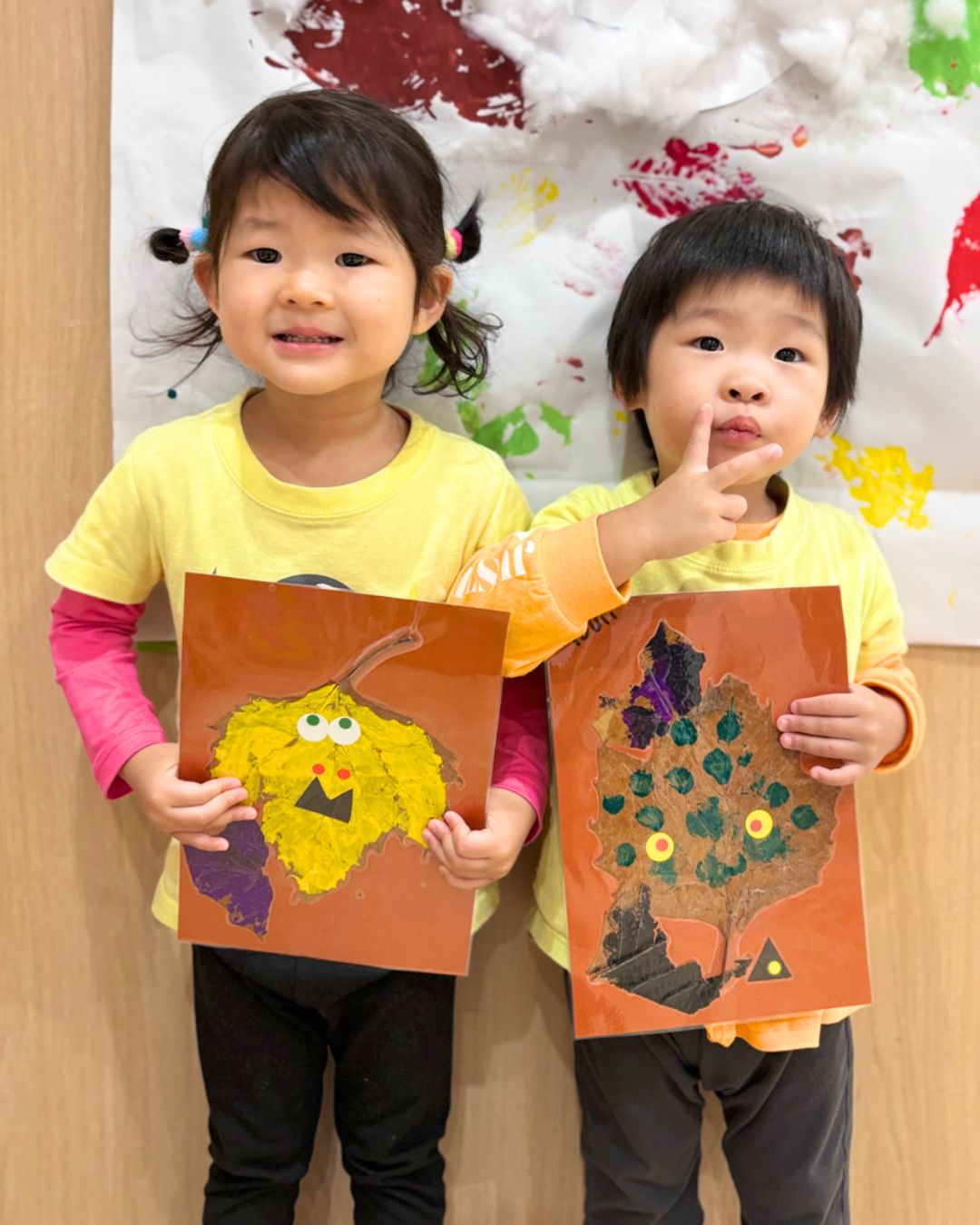 子どもたちはお気に入りの色を使って葉っぱにペイントやスタンプをし、色を混ぜて新しい色を作る姿も見られました。