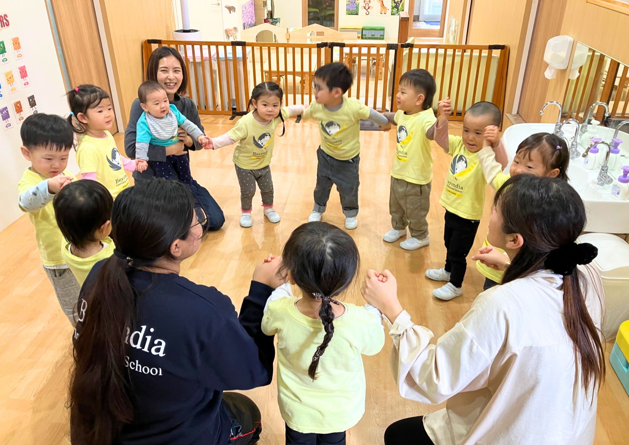 パンプキン・ピーナッツクラスでは、毎週リトミックのレッスンを楽しんでいます。レッスンは名前呼び、歩いて止まる、リズムを聴く、スカーフ遊び、最後の落ち着きの時間、といった基本の流れに沿って行われ、季節のゲームやお話など、新しい要素も取り入れています。最近では、ベビー&ママプログラムのお友だちと保護者も参加しており、親子での音楽や運動体験を通して、社会性や表現力を育む貴重な機会となっています。